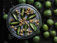 Wer morgens wenig Zeit hat, vermengt die Chia-Samen und die Milch bereits am Vorabend und lässt den Chia-Pudding über Nacht im Kühlschrank quellen. Morgens schneidet man dann nur noch die frischen grünen Früchtchen, füllt die verschiedenen Zutaten in ein Glas mit Schraubverschluss und fertig ist die kleine, gesunde Zwischenmahlzeit für den anstehenden Arbeitstag.