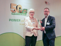 Heute überreichte Klaus-Jürgen Philipp, Präsident des Verbands der deutschen Fruchtsaft-Industrie (VdF), im Namen der deutschen Fruchtsafthersteller symbolisch die einmilliardste Glas-Mehrweg-Flasche an Ministerialdirigentin Dr. Bettina Hartwig. Seit 50 Jahren ist das verbandseigene Kreislauf-System im Einsatz und bis heute wurden 1 Milliarde Flaschen als Neuglas eingespeist. Mit viel Weitblick und einer großen Portion Pioniergeist gestartet ist die Solidargemeinschaft der deutschen Fruchtsafthersteller heute Sinnbild einer nachhaltigen Kreislaufwirtschaft, wie auch Ministerialdirigentin Dr. Bettina Hartwig während der Verleihung betonte: „Es ist ein gelungenes Beispiel der Verbindung von Ökonomie und ökologischer Verantwortung. Damit ist das System im Einklang mit dem erklärten Ziel der Bundesregierung, eine Stärkung der Abfallvermeidung durch ökologisch vorteilhafte Mehrweg-, Rücknahme- und Pfandsysteme zu erreichen.“