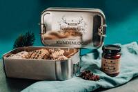 Regionale Geschenkideen, lebensmittelecht in silberner Metalldose mit Gravur verpackt und Einzelversand möglich