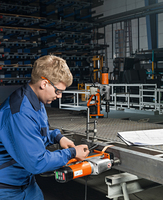 Die FEIN KBM 50 und KBM 65 verfügen über eine intuitive Bedienung. Sechs großflächig angeordnete Bedienelemente sind einfach zu erreichen und im direkten Blickfeld des Anwenders auf der Bohrmotoroberseite. Eine Komfort-Magnethaltekraftanzeige unterstützt den Anwender beim sorgfältigen Ansetzen der Maschine auf der Werkstückoberfläche: Leuchtet der Magnetschalter permanent auf, ist die Haltekraft voll gegeben. Blinkt der Taster, ist die Materialoberfläche dünn, uneben, verschmutzt oder verzundert und damit die Haltekraft verringert. Die Magnethaltekraft ist im Vergleich zu den Vorgängermodellen um bis zu 25 Prozent erhöht. Dank um 45 Grad angefaster Kanten im vorderen Bereich der Magneten haben die Maschinen ein gutes Eckmaß für den Einsatz im Stahlträger-Steg. Verlängerte Magnetfüße verbessern die Hebelverhältnisse und sorgen so für einen festen Halt gegen Abdrücken und Losreißen der Maschine.