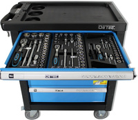 Die im Wagen enthaltenen Werkzeuge wurden aus Chrom Vanadium-Stahl gefertigt. Dazu gehören unter Anderem: 3 Ratschen/Knarren in den Größen ein Halb/ein Viertel- und drei Achtel-Zoll. Dazu wurden jeweils passende Nüsse in den gängigen Größen sortiert. Zudem gibt es im Werkstattwagen Maul-Ringschlüssel und gekröpfte Ringschlüssel in verschiedenen Maßen, Schraubendreher und Langnüsse, Innen-Torx-und Inbus-Nüsse, Winkel-Inbusschlüssel-und Sechskantschlüssel, und Hammer- sowie Zangensets.
