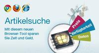 Die „Artikelsuche“ ist erhältlich für den Internet Explorer, Mozilla Firefox und Google Chrome. Zu Beginn der europäischen Markteinführung ist das Browser-Tool ab sofort in Großbritannien, Deutschland, Frankreich, Italien, Polen und Spanien auf Webseite von Farnell element14 zum Download verfügbar ( http://de.farnell.com/artikelsuche?ICID=I-HPBL-LDBR-0107?CMP=PRR-EUR-13-0033 ). Hier finden Sie auch weitere Informationen sowie ein Video, welches das Tool genauer erklärt.