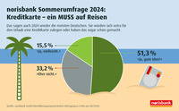 Etwa ein Drittel der Befragten (32,7 Prozent) hat sich zudem schon einmal extra für den Urlaub eine Kreditkarte angeschafft. Denn die meisten Buchungen oder Reservierungen sind nur per Kreditkarte möglich und lassen sich damit auch bequem abwickeln, sei es für Flüge, Hotels, Event-Tickets oder Mietwagen. Und da ist beispielsweise die norisbank Mastercard direkt wie gemacht für die nächste Reise: Mit der bei norisbank Kunden sehr beliebten Debitkarte lässt sich weltweit bargeldlos bezahlen und außerdem kostenlos Bargeld abheben – 12-mal pro Jahr weltweit an allen Geldautomaten mit Mastercard Logo und darüber hinaus im Ausland an den Geldautomaten der Kooperationspartner (Bank of America (USA), Barclays (Großbritannien), BGL (Luxemburg), BNP Paribas (Frankreich), Scotiabank (Kanada, Mexiko), TEB (Türkei), Westpac (Australien, Neuseeland)). Im ersten Jahr sogar ohne Jahresbeitrag. So beginnt die Entspannung schon vor dem Urlaub – auch im Sommer 2024.