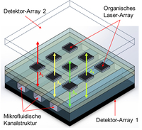 Das optofluidische Analysesystem besteht aus den organischen DFB-Lasern, die jeweils in einem spezifischen Wellenlängenbereich Licht emittieren. Eine Flüssigkeit, die durch die darunter liegenden Mikrokanäle fließt, kann dementsprechend auf ihr Absorptionsverhalten bezüglich jeder der verwendeten Wellenlängen hin untersucht werden. Als Referenzsignal dient die zweite Abstrahlrichtung der Laser. Das Analysesystem kann günstig für jede beliebige Wellenlänge des sichtbaren Lichts sowie im nahen Infrarot (NIR) realisiert werden. Die Materialien, aus denen die organischen DFB-Laser und sonstige Strukturen bestehen, sind zudem ungiftig und können daher ohne Beschränkungen entsorgt werden.