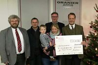 Nikolaus Fleischhacker, Geschäftsführer der ORANIER-Gruppe, bei der Übergabe eines entsprechenden Schecks an das Ehepaar Richter: „Wir wünschen dem kleinen, tapferen Robin weiterhin gute Besserung und hoffen, dass der Einbau des Lifts sein Leben und das seiner Eltern wieder ein bisschen lebenswerter macht.“