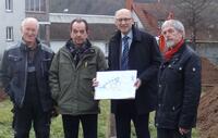 Zum Start der Bauarbeiten für das neue Firmengebäude des peridomus Instituts Dr. Führer trafen sich im Gewerbegebiet in Himmelstadt (bei Würzburg) Waldemar Beck, WB Bauunternehmen GmbH, Bürgermeister Gundram Gehrsitz, Institutsleiter Dr. Gerhard Führer und Landschaftsarchitekt Günter Hurrlein.