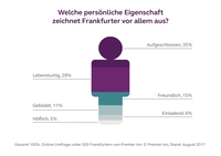 Auf die Frage, welche persönliche Eigenschaft einen Frankfurter in erster Linie auszeichnet, nannte über ein Drittel der Befragten, dass die Stadtbewohner vor allem aufgeschlossen sind. Lebenslustig urteilt mehr als ein Viertel, freundlich landet mit 15 % auf dem dritten Platz. Keine schlechten Voraussetzungen für Touristen, die echte Frankfurter kennenlernen möchten.