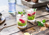 Dem Mojito Mocktail verleihen Himbeeren und Holunderblütensirup den besonderen Geschmack. Natürliches Mineralwasser spielt bei dem aromatischen Durstlöscher sogar eine Doppelrolle – als Basis für das Mixgetränk sowie in Form von „Crushed Ice“.