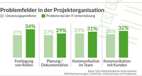 Bildunterschrift: Jeweils über 30 Prozent der Unternehmen aller Größenklassen berichten von Problemen bei der Umsetzung und Software-Unterstützung in der Projektzusammenarbeit