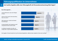 „Die offene Aussprache von Defiziten zeigt vor allem Folgendes: Führung beschäftigt jeden und Führung ist nirgendwo so perfekt, als dass sie sich nicht verbessern ließe“, so Petra Timm, Sprecherin bei Randstad Deutschland. 77 Prozent der Befragten bekleiden selbst eine Führungsposition und reflektieren im Rahmen der Umfrage, was von einem Chef erwartet wird. Am wichtigsten ist den Befragten (65 Prozent) folgende Eigenschaft: „Eine Führungskraft sorgt für eine motivierende Arbeitsatmosphäre unter den Kollegen im Team.“ Außerdem möchten Arbeitnehmer informiert sein. Rund 58 Prozent sprechen sich dafür aus, dass ein guter Chef auf einen guten Informationsfluss, intern wie extern, achtet. Zudem sollte er fundiert Entscheidungen treffen und im Auge behalten, dass Zielvorgaben eingehalten werden (rund 54 Prozent).