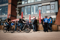 Doch zuerst machen wir eine Pause und kaufen bei einem Kiosk ein Bier. Die Flaschenöffnerfunktion an meinem Minitool von Lezyne leistet uns dabei gute Dienste. Wir können auch ein paar HSV-Fans aus der Patsche helfen, die neidisch von ihren verschlossenen Bierflaschen auf das Tool schauen. Schnell kommen wir mit ihnen ins Gespräch und sie staunen noch mehr über unsere E-Bikes. „Ihr seid doch viel zu jung für so was“, lautete einstimmig das Urteil der Gruppe. „Quatsch,“ entgegne ich, „das E-Bike ist der perfekte Autoersatz in der Stadt – das hat doch mit dem Alter nichts zu tun!“ Und Arne erzählt von seinen jüngsten Erfahrungen mit einem E-Mountainbike: „Man ist immer am Anschlag und schafft deutlich mehr Kilometer. Ich war nach einer Tour noch nie so fertig.“ Die Argumente scheinen die jungen Männer zwar nicht völlig zu überzeugen, aber zumindest geraten sie ins Grübeln. Aber jetzt steht eh erst einmal Fußball auf dem Programm. Sie verabschieden sich ins Stadion.