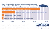 Die Anzahl der Baustellen in Deutschland hat zugenommen: Das sieht auch die Mehrzahl der deutschen Autofahrer so. Laut einer repräsentativen Umfrage des Kfz-Direktversicherers DA Direkt haben sieben von zehn Befragten das Gefühl, dass die Zahl der Baustellen gegenüber dem Vorjahr spürbar zugenommen hat. Damit einher geht in den Augen der Befragten auch ein erhöhtes Sicherheitsrisiko: Jeden Dritten hat eine Baustelle nach eigenen Angaben schon einmal in eine brenzlige Situation gebracht. Weiterhin schätzen 42 Prozent Baustellen als Ablenkung ein.
