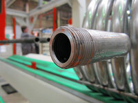 Die weitere Bearbeitung der Enden erfolgt ebenfalls in der Rohrbearbeitungsanlage. Ein besonderer Kundenwunsch beim Fertigungsprozess war es, neben dem Gewinde – das zur Abdichtung verwendet wird – auch eine stirnseitige Dichtfläche zu erzielen. Diese Fläche wird nach dem Einbau mit einem weiteren Element zusätzlich abgedichtet. Die Lösung der südwestfälischen Ingenieure: Ein Roboter mit Doppelgreifer übernimmt die Spiralen aus der Rohrbiegemaschine und übergibt sie der Rohrbearbeitungsanlage. Die bereits vor dem Rohrbiegevorgang ermittelten Maße werden hier nochmals verarbeitet, um sicherzustellen, dass auch beide Enden in der Länge und im Abstand zum Wendel exakt gleich sind. Anschließend werden die beiden Rohrenden orbital spanlos getrennt. Dann wird der Bereich kalibriert, in dem später das Gewinde liegt und die stirnseitige Dichtfläche angebracht. In einem weiteren Schritt schneidet die transfluid-Fertigungszelle für die Rohrbearbeitung die Gewinde und bearbeitet die stirnseitige Dichtfläche spanend nach.