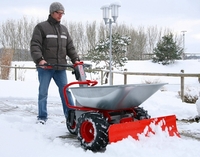 Wer den elektrischen Minidumper TeMax hat, kann den frostigen Monaten gelassen entgegenblicken, denn für den multifunktionellen Dumper gibt es ein robustes Schneeschild. Es hat eine Räumbreite von einem Meter und kann manuell am Bediengriff in drei verschiedene Räumwinkel eingestellt werden. Die Profile der Ackerstollenreifen sorgen für einen guten Grip auf der Schneefläche und in der Mulde kann Streukies oder Streusalz gleich