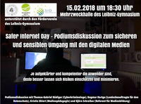 Anlässlich des Safer Internet Day 2018 erarbeiten die Schüler der Jahrgangsstufe 8 des Leibniz Gymnasium am Vormittag des 15. Februar 2018 in mehreren Workshops gemeinsam mit den Lehrern die Themen Cybergrooming und Sexting. Dabei halten sie ihre Erfahrungen und Sichtweise zu diesen Themen auf verschiedenen Medien wie zum Beispiel per Video, Podcast aber auch als Poster und weitere Medien fest.