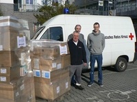 Den Transport der zwei hoch beladenen Europaletten hat der Ortsverband Osnabrück vom Deutschen Roten Kreuz übernommen. Gemeinsam mit dem Sanicare -Mitarbeiter Andre Buddendiek haben die DRK-Aktiven Johannes Frankenberg und Peter Bülow die schon sehnsüchtig erwarteten Nahrungs- und Verbandsmittel in den Transporter verladen.