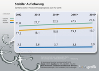Ansonsten habe die mittelständisch geprägte Sanitärbranche „wenig Grund zur Klage“. 2016 werde voraussichtlich das siebte Wachstumsjahr in Folge. So prognostiziere das ifo-Institut für das laufende Jahr ein erneutes Umsatzplus von 3 % auf 23,6 Mrd. Euro. Danach steigen die Verkaufserlöse im Inland mit 3,1 % auf 19,7 Mrd. Euro etwas schneller als die im Ausland (+ 2,6 %).