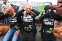 Daher demonstriertne Mitglieder des Bündnisses heute erneut vor dem Zwinger. Drei Aktivisten hielten sich Augen, Ohren und Mund zu, um darauf aufmerksam zu machen, wie der Bezirk Mitte mit selbst verursachtem Tierleid umgeht: nichts sehen, nichts hören, nichts sagen.