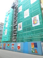 Kinder der Weyersbergschule haben mit Künstler Horst Reinsdorf 16 großformatige Bannerbilder für den Rohbau der neuen Geschäftsstelle der PSD Bank RheinNeckarSaar eG gestaltet. Die Installation ist seit 26. Mai 2014 in der Bahnhofstraße zu sehen.
