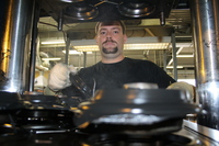 Einer seiner Mitarbeiter ist Tino Lemme. Wenn der Schichtleichter an einer der neun Maschinen in der Produktionshalle steht, wird dem Beobachter schnell klar: Der Mann ist absoluter Experte in seinem Fach. Er kennt die Maschine bis ins kleinste Detail. „Ich kann bereits bei der Produktion am Geräusch der Maschine erkennen, ob die Produkte einwandfrei werden oder nicht“, erklärt Lemme. Rund 1.200 Stück fertigt er in einer Schicht. An einer Maschine entstehen dabei ganz unterschiedliche Teile. „Auch wenn die meisten schwarz sind, heißt das nicht, dass sie gleich sind. Wir können alles von temperaturbeständigen bis zu sehr flexiblen oder sehr harten Werkstoffen anbieten – je nachdem, was der Kunde wünscht.“ Im gekühlten Mischungslager warten unterschiedliche Gummimischungen mit verschiedenen Eigenschaften auf ihren Einsatz. „Die Gummimischungen werden passend zu den Lieferabrufen eingekauft“, so Claus Gernert.