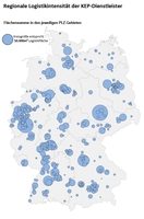 Der Blick auf die regionale Verteilung der Logistikimmobilien, Paketzentren und Umschlagsstandorte der KEP Branche zeigt einen nahezu flächendeckenden Besatz mit diesem Immobilientyp. Auch Regionen, in denen sonst kaum Logistikimmobilien zu finden sind, wie z. B. Mecklenburg-Vorpommern, weisen entlang der Autobahnen zahlreiche Paketdepots auf. Häufungen ergeben sich besonders in der Nähe der Ballungsräume. Hier sind in der Regel die lokalen Depots der Kurier-, Paket- und Expressdienstleister angesiedelt, von denen aus die KEP Unternehmen versorgt werden, um die zuverlässige Abwicklung der letzten Meile vor Ort zu gewährleisten. Die größten lokalen Flächensummen entfallen auf die Flughäfen Leipzig-Halle und Köln-Bonn, die von DHL bzw. UPS als internationale Gateways für Luftfracht-Paketsendungen genutzt werden und so vergleichsweise große Umschlagsflächen aufweisen.