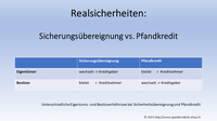 Der entscheidende Unterschied bei diesen beiden Formen der Realsicherheiten, Pfand und Sicherungsübereignung, besteht in der rechtlichen Konstruktion: Bei der Sicherungsübereignung bleibt der Kreditnehmer Besitzer, der Kreditgeber wird Eigentümer, und beim Pfandkredit wird der Kreditgeber Besitzer, und der Kreditnehmer bleibt Eigentümer.