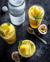 3. Rosmarin waschen. Maracujaeiswürfel in zwei Gläser geben, Maracujanektar und Rosmarinsirup auf die Gläser aufteilen. Anschließend mit Mineralwasser aufgießen und mit einem Rosmarinzweig garnieren. Maracujas halbieren, Kerne herauskratzen und in die Drinks geben.