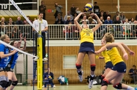 Überzeugte mit knallharten Angriffen bei den Kölnerinnen: Kölns Außenangreiferin Laura Mertens (hier im Heimspiel gegen Hamburg; Foto: Martin Miseré)Auch die…