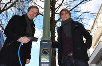 Tim Loppe (NATURSTROM AG) und Marcel Maintz (Ebee) vor Berliner Ladelaterne.Berlin, 17.02.2015. Elektrofahrzeuge beziehen in Berlin nun Ökostrom direkt aus…