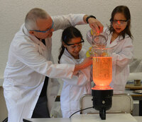 Chemisch-physikalische Bühnenshow in der "Experiminta" Akkusäule zur Erzeugung von HochspannungHaarsträubende Effekte mit Hochspannung, Ballonexplosionen mit Laserpointer und andere interessante Versuche…
