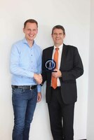 3. Platz bei Funkschau Leserwahl zum "ITK-Produkt des Jahres" Eric Weis (links), Funkschau, gratuliert Ralf Kalker (rechts), Vertriebsdirektor DACH bei…