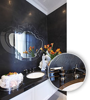 Dunkel gespachtelte Wände und mundgeblasene Wandspiegel aus Muranoglas prägen die beiden Badezimmer für Gäste. Hier finden sich Knäufe aus schwarzem Porzellan mit weißer Schrift „chaud“ und „froid“ im Chanel-Stil. Die Armaturen in den Bädern der beiden Kinderzimmer sind in klarem, puristischen Design. Im Wellnessbereich wurde ebenfalls eine klassisch moderne Armatur eingesetzt.