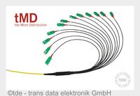tde has designed the cables as classic loose tube cables with 12 or 24 MM OM3/OM4 or single-mode optical fibres in one tube. The tMD cables are preterminated with all customary fibre optic connectors including the MPO/MTP multi-fibre connector. The extremely thin cable fanouts have a diameter of 10 mm and are 60 mm long. In this way, the fanout units are easily accommodated in the patch panel. The individual cable whips each have a cable diameter of 1.6 mm. Their length can be customised.