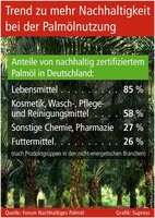 „Deutschland als einem der größten Palmölverarbeiter weltweit kommt hierbei eine besondere Verantwortung zu“, heißt es in einer Erklärung des Bundesministeriums für Ernährung und Landwirtschaft (BMEL), das zu den Mitinitiatoren des „Forums Nachhaltiges Palmöl“ gehört. Dieser Zusammenschluss zahlreicher Verbände, Organisationen und Unternehmen hat es sich zur Aufgabe gemacht, dass in Deutschland bis zum Jahr 2020 nur noch nachhaltig produziertes Palmöl aus zertifiziertem Anbau zum Einsatz kommt ( www.forumpalmoel.org). Seit seiner Gründung im Jahr 2013 ist das Forum in enger Zusammenarbeit mit den Erzeugerländern diesem Ziel bereits in großen Schritten näher gekommen. Erfreulicherweise zeigt sich der Trend zur Nachhaltigkeit dort besonders konsequent, wo die Verbraucher durch ihr Einkaufsverhalten der zertifizierten Ware den Vorzug geben können. Spitzenreiter bei den nichtenergetischen Sektoren des Palmölverbrauchs ist die Lebensmittelbranche. Hier wird zertifiziertes Palmöl bereits zu 85 Prozent eingesetzt. Bei Kosmetik sowie Wasch-, Pflege- und Reinigungsmitteln für Privathaushalte beträgt der Anteil 58 Prozent. Im Vergleich zu den Vorjahren zeigen die aktuellen Zahlen auch in der Futtermittelbranche nach oben, mit 26 Prozent an nachhaltigem Palmöl allerdings noch auf niedrigem Niveau. Nachholbedarf gibt es bei einem Zertifizierungsanteil von 27 Prozent auch im Chemie- und Pharmaziesektor. „Wir erwarten aber auch, dass alle Branchen ihre Verantwortung für Umwelt und Menschenrechte ernst nehmen und auf zertifiziertes Palmöl umstellen“, sagt Michael Stübgen, Parlamentarischer Staatssekretär im BMEL.