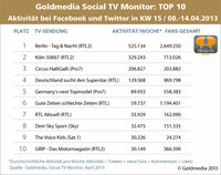 Goldmedia erhebt seit KW 26/2012 die Zuschaueraktivität zu fernsehbegleitenden Inhalten im Internet (Social TV) für Deutschland und die Schweiz. Die Analysen werden jeden Dienstag für die vergangene Woche auf www.social-tv-monitor.de veröffentlicht.