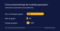 Die Pandemie hatte aber nicht nur Auswirkungen auf den Abschluss und die Übernahme, sondern auch auf den Ausbildungsstart 2020/2021. Im Vergleich zum Vorjahr konnten nur 40% aller Unternehmen die gleiche Anzahl an jungen Menschen in den Beruf führen. 14% stellten weniger, 20% gar keine neuen Azubis ein. „Um ihre Ausbildung auch in der Krise anzukurbeln, stehen Unternehmen finanzielle Förderprogramme der Bundesagentur für Arbeit zur Verfügung“, erklärt Dr. Kahlenberg. „Das Bundesprogramm „Ausbildungsplätze sichern“ setzt sich dabei gezielt für die Übernahme von Azubis ein, die von einem wirtschaftlich angeschlagenen Unternehmen zu einem anderen wechseln.“