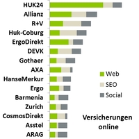 Analysiert wurden die 42 online-aktivsten deutschen Versicherungen: AachenMünchener, Allianz, Alte Leipziger, ARAG, Asstel, AXA, Barmenia, Basler, BGV, Continentale, CosmosDirekt, DA Direkt, Debeka, DEVK, Ergo, ErgoDirekt, Generali Deutschland, Gothaer, Hannoversche, HanseMerkur, HDI, HUK24, Huk-Coburg, Itzehoer, LVM, Mannheimer, Münchener Verein, Nürnberger, Provinzial NordWest, Provinzial Rheinland, R+V, Signal Iduna, SV, Talanx, VGH, VHV, VKB, Volksfürsorge, Westfälische Provinzial, Wüstenrot & Württembergische, WWK, Zurich Deutschland.