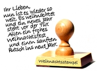 Sich für jeden Bekannten einen persönlichen Text für die Weihnachtskarte zu überlegen, fällt schwer und kostet Zeit. Abhilfe schafft ein Stempel: In Schönschrift platziert er diesen Text auf jeder Karte: „Ihr Lieben, nun ist es wieder so weit. Es weihnachtet und ein neues Jahr steht vor der Tür. Allen ein frohes Weihnachtsfest und einen sanften Rutsch ins neue Jahr.“