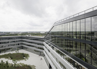 Hinter den markanten horizontalen Sonnenschutzlamellen verstecken sich massive Brüstungen, die den Glasanteil der Fassade reduzieren und somit energetisch eine besseren Dämmwert zu erreichen und Pluspunkte zur Zertifizierung des Gebäudes sammeln. Die Lamellen weisen unterschiedliche Abstände auf, so dass auf Augenhöhe im Stehen und im Sitzen eine geringere Dichte gegeben ist. Horizontal ist der weite Blick nach außen immer gewährleistet. Das Dach wird als fünfte Fassade mit einer extensiven Begrünung bewusst gestaltet und mit Kinderspielfläche und Dachterrassen genutzt.