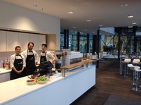 Das architektonisch eindrucksvolle neue Zuhause von BMW in Berlin wurde am 8. April 2014 unter anderem von Klaus Wowereit, dem regierenden Bürgermeister der Hauptstadt, feierlich eröffnet. Im Erdgeschoss der bemerkenswerten Glaskonstruktion am Kaiserdamm sorgt eine chicco di caffe Kaffeebar für das leibliche Wohl der rund 300 BMW-Mitarbeiter und der Besucher, die sich auf einem der über 100 Plätze eine erholsame Auszeit gönnen können. Dabei haben die Gäste neben dem Sitz- und Stehbereich auch die Möglichkeit, sich in eine etwas ruhigere Lounge-Zone in der ersten Etage zurückzuziehen. Für diejenigen, die sich von der Betriebsamkeit auf der Straße inspirieren lassen wollen, bieten chicco di caffe auch etwa 30 Außenplätze an. Von den leckeren Speisen und Getränken profitieren nicht nur die BMW-Mitarbeiter, sondern alle Liebhaber von ausgesuchten Lebensmitteln, da es sich um eine öffentlich zugängliche Kaffeebar handelt. Neben Espresso- und Kaffeespezialitäten steht ein täglich wechselndes Angebot an erstklassigen Snacks und Kuchen in gewohnter chicco di caffe-Qualität zur Verfügung. Abgerundet wird das Cafe-Erlebnis durch den professionellen Service der freundlichen Mitarbeiter.