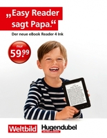 Weltbild und Hugendubel setzen auf Kinder als Protagonisten für die neue Art zu lesen. Die Kids beschreiben den ebook Reader 4 und seine Funktionen in ihren eigenen Worten. So umschreiben sie, was in der Marketingsprache landläufig „Produktvorteil“ heißt, von „Lesen wie auf Papier“ bis „Akku hält ewig“. Das ist mal altklug, mal ernst, mal komisch, und immer echt.