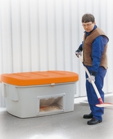 Im Sommer können die Streugutbehälter Platz sparend gelagert werden. Denn mit aufgeklapptem oder demontiertem Deckel sind sie problemlos stapelbar. Der Deckel lässt sich leicht ohne Werkzeug entfernen. Darüber hinaus sind die Behälter zum Schutz vor unbefugter Entnahme des Streugutes abschließbar.