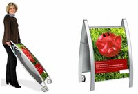 Während die marktüblichen A-Ständer aus fernöstlicher Produktion aus dünnen Alu-Profilen gebaut sind und beim ersten schwachen Windzug davonfliegen, bleibt der PASSAT mit seinen 11 kg Gesamtgewicht unbeirrbar auf dem Boden stehen. Die integrierten Transportrollen ermöglichen dabei trotz des hohen Gewichts eine Rücken schonende, kinderleichte Beweglichkeit des klappbaren Gehwegaufstellers.